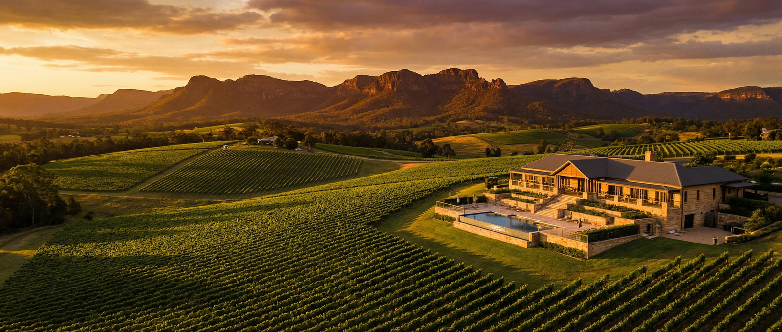 Nestled in the heart of the Hunter Valley wine region, surrounded by vineyards and the stunning Brokenback Range.